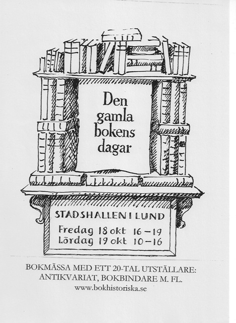 Fredagen den 18:e och lördagen den 19:e oktober kommer vi att ha stängt i butiken för att istället vara i Stadshallen i Lund på Den gamla bokens dagar, arrangerat av Bokhistoriska Sällskapet. Vi kommer att ha med ett urval av vårt sortiment till försäljning.