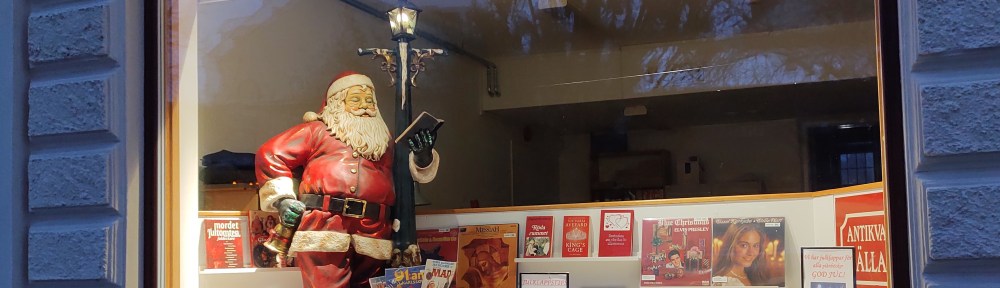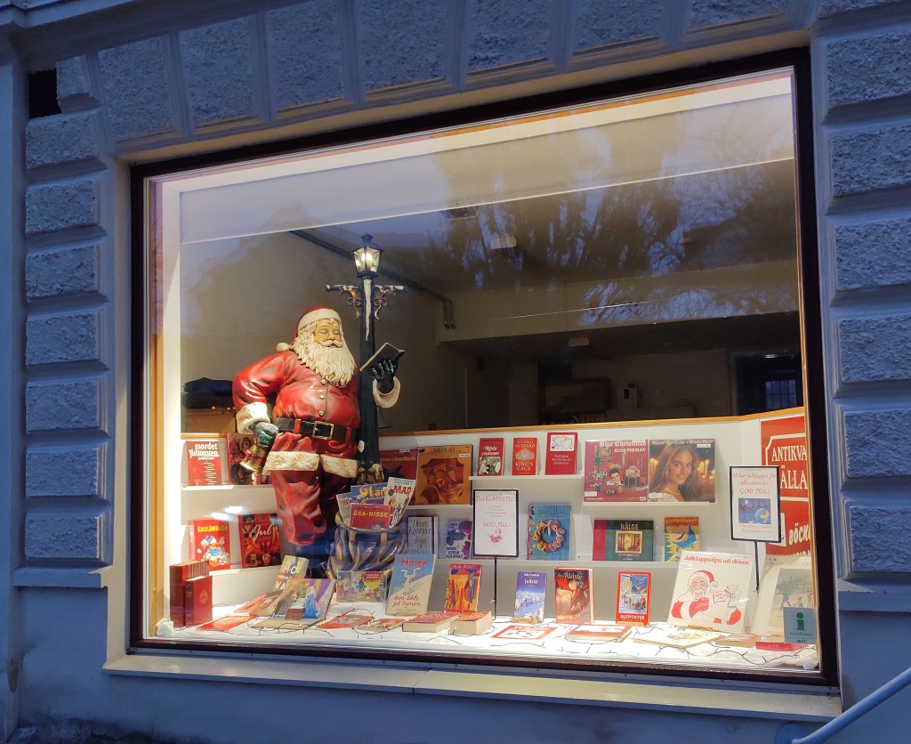 Som ni kanske har sett har tomten stannat till i vårt skyltfönster, fullt upptagen med att läsa en bok. Vi får väl hoppas att han hinner med att besöka dem av er som varit snälla i år och inte glömmer bort det. Det är lätt att fastna i en bok, upplevelsen av att den inte går att släppa är nog något de flesta bokälskare upplevt någon gång, och vintern i Skåne uppmuntrar ju sällan till aktiviteter utomhus i så många dagar. När jag växte upp var ofta Juldagen den bästa av de tre juldagarna, då hade man fått sina böcker (man visste att det fanns böcker i några av paketen), och det hände ofta att vi satt på våra olika favoritplatser i vardagsrummet med varsin bok i handen och lite nötter eller annat julgodis inom räckhåll. Var och en i sin värld, men tillsammans.